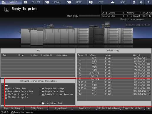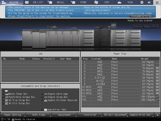 supplementary explanationThe help message can also be displayed by pressing each item in the Consumable/Scrap area at the bottom left of the MACHINE screen. This function is useful to access directly to a help message for the item selected. In this case, proceed to step 5.