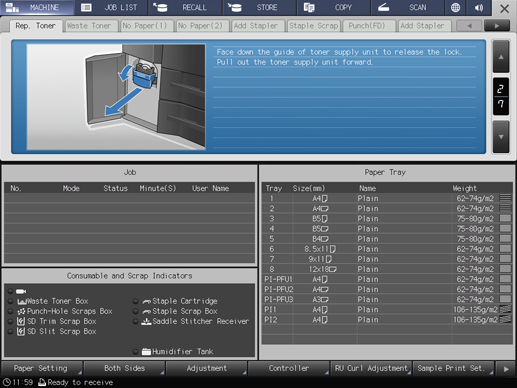 With the MACHINE screen opened, it displays the method to replace a toner bottle or waste toner box, add staples, dump staples, punch, or trim scraps, supply glue pellets, load paper, and replenish water to the humidifier tank.