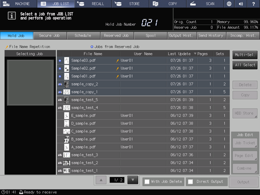 This screen is displayed when Secure Job is pressed on the JOB LIST screen. This screen is available to store print jobs sent from the PCL driver or PS Plug-in driver on the computer. A print job stored as a secure job can be edited. To print, press Output on the Secure Job screen. When output is completed, the stored print job is deleted.