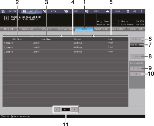 6 | Details | Press when a job having the status of Number Limit (Waiting) is selected. You can check the location to save the job, etc. |