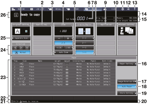 14 | Output information indicator | The upper part shows the print quantity of the current print job and set quantity. The lower part shows the job number of the current print job and a user name (when a user name is entered for user authentication) or a section name (when a section name is entered for section authentication). |