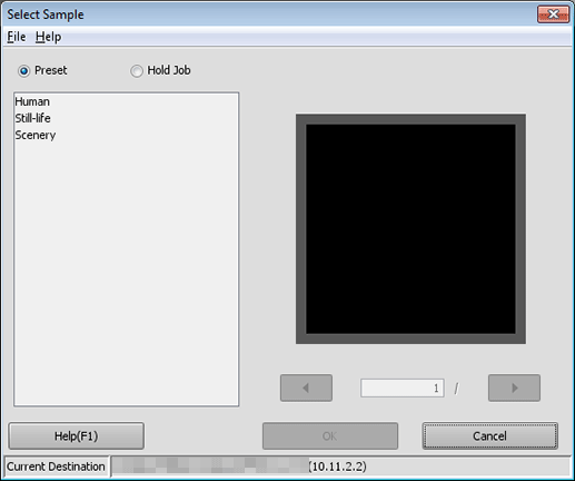 (list) | According to the selection of Preset/Hold Job, displays a list of preset images or a list of hold jobs (file name and registration date/time) in the image controller which is connected currently. Secure Print jobs are not displayed. |