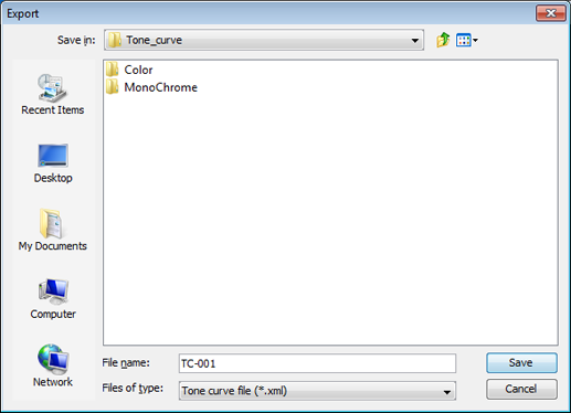 You can export a tone curve of the image controller to Local, My Documents, or Network as a profile (Extension: .xml).