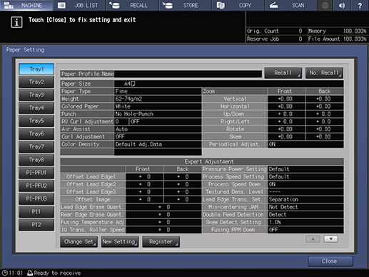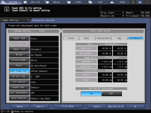 On the MACHINE screen, press Adjustment - Quality Adjustment - Periodical Both Sides Adj. in sequence, and set Period. Both Sides Auto Adj. to ON. You can then set Periodical Adjustment to ON or OFF. For the tray set to ON, Periodical Adjustment is available. For details, refer to Periodical Both Sides Adj..