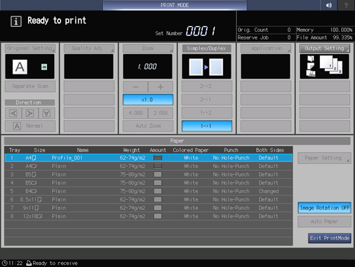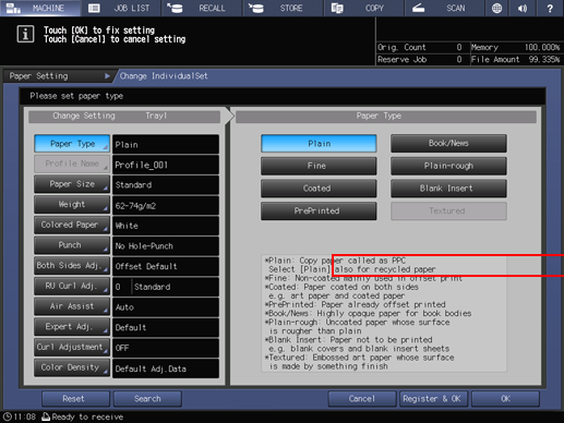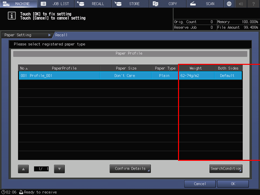 Select a paper profile of the paper brand (paper profile name), Paper Size, Paper Type, and Weight, which are the same as for the paper to be adjusted, then press OK.