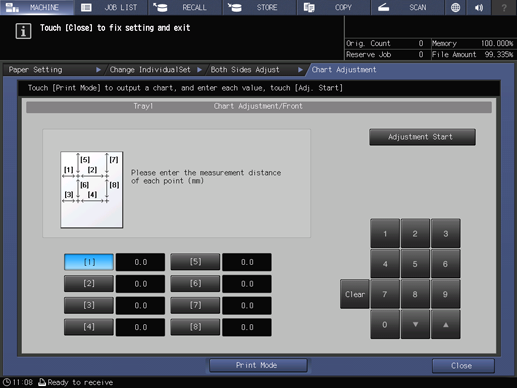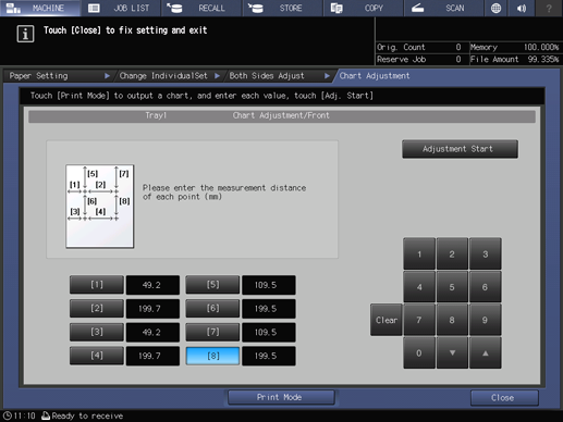 Output the front side adjustment chart again, then check the lengths at points [2], [4], [6], and [8] on the second and third output charts.