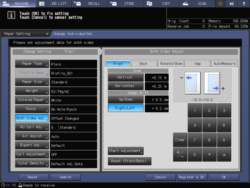When the front side adjustment is performed for paper of a new brand, weight, or size, press Register & OK, then proceed to the next step.