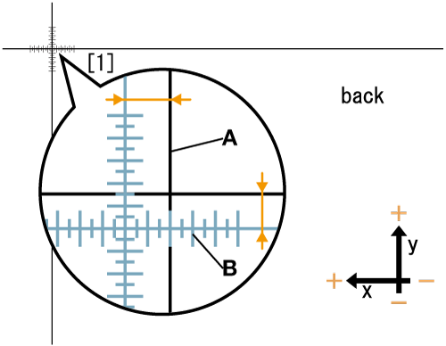 supplementary explanationFor example, when the cross (+) of [1] is misaligned by 2.0 mm in the plus side in the X-axis direction and 1.5 mm in the minus side in the Y-axis direction compared with the front side as shown in the figure, move the blue line in the back side by 2.0 mm in the minus side in the X-axis direction and 1.5 mm in the plus side in the Y-axis direction.
