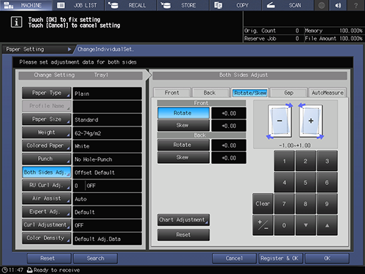 If User Setting or Administrator Setting - Common Setting - Both Sides Rotate/Skew in UTILITY is set to Disable, the Rotate/Skew adjustment does not function. To perform the Rotate/Skew adjustment, set Both Sides Rotate/Skew to Enable.