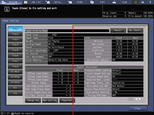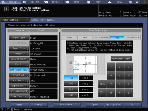 When the gap adjustment is performed for paper of a new brand, weight, or size, press Register & OK, then proceed to the procedure shown in Registering Paper Profile.