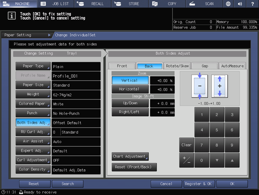If the position of the image on the front side is different from that of the image on the back side, enter the adjustment value in Up/Down (crosswise direction) and Right/Left (feed direction).
