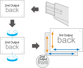 Put the third output chart (with the back side facing upward) on the second one (with the front side facing upward), then compare the interval of the image on the front side with that of the image on the back side. When you want to invert paper, set the rotation axis in the crosswise direction.