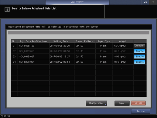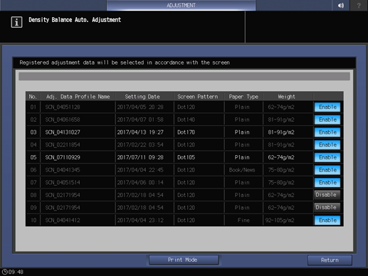 (1) Adjustment value of same screen, same paper type, same weight, and old date