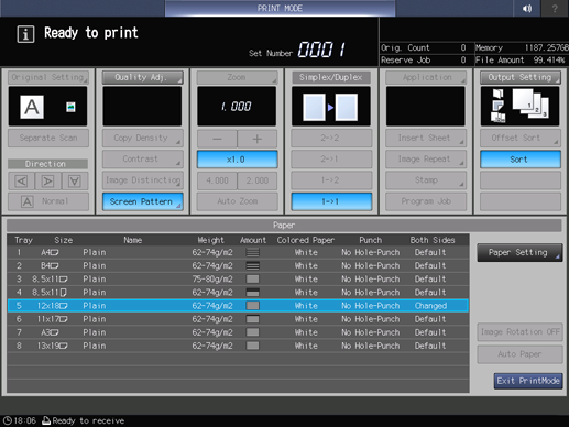 supplementary explanationLoad paper of A3 short edge feed, 11 17 short edge feed, 12 18 short edge feed, or SRA3 short edge feed into the tray, and select the button of the tray.