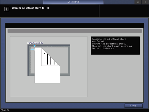 supplementary explanationTake the test chart away from the vertical size guide by 2 inches (5 cm), then push it against the horizontal size guide to load the test chart.