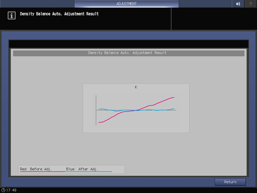 After the chart is output, follow the procedure to scan the chart; the values before and after adjustment are indicated by a graph, and the Density Balance Auto. Adjustment Result is displayed.