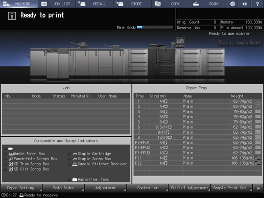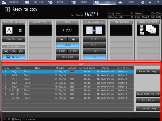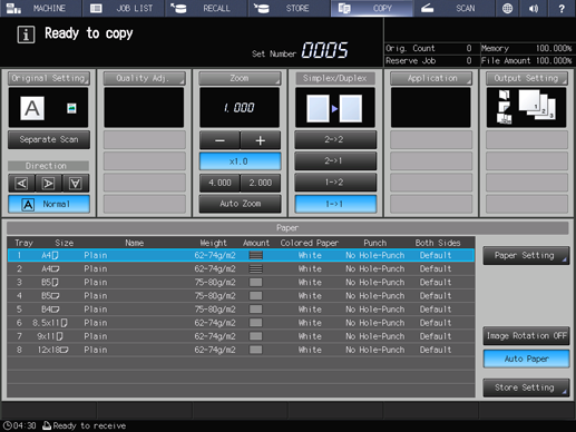 The MACHINE screen shows up first at the default setting. To display the COPY screen, press the COPY tab on the MACHINE screen.