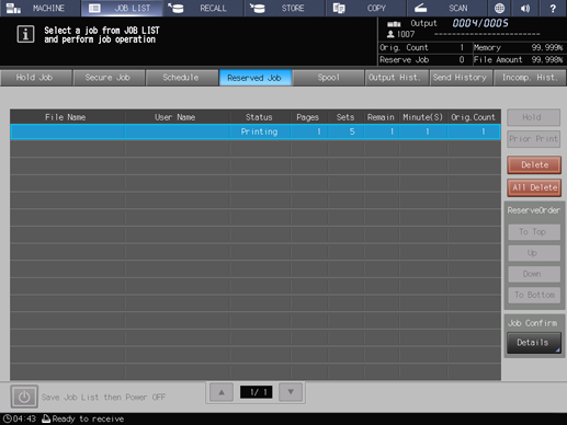 You can change the operation order of reserved jobs or cancel reserved jobs in the JOB LIST screen. For details, refer to JOB LIST Screen.