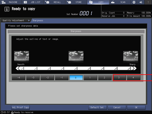The screen returns to the COPY screen. The Sharpness indication can be found under Quality Adj. on the COPY screen.