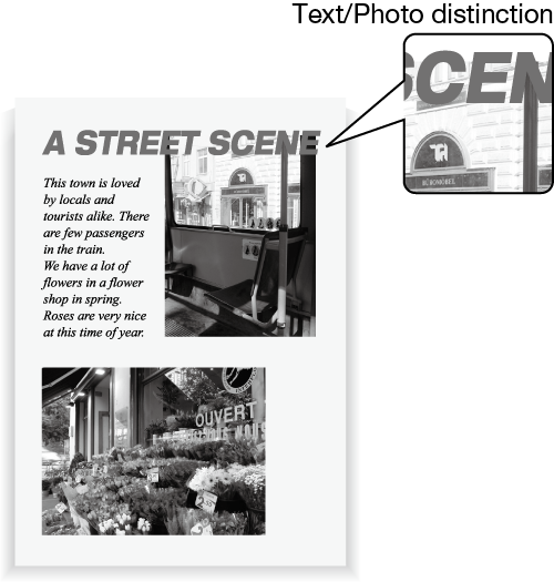 In many cases, originals include both photo and text in one page. Such an original is divided into the text part and the photo part.