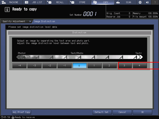 After making the desired adjustment, press Adj.Proof Copy on the Quality Adjustment screen, Adj.Proof Copy on the Image Distinction screen, or Proof Copy on the control panel. Check the adjustment result with output image.