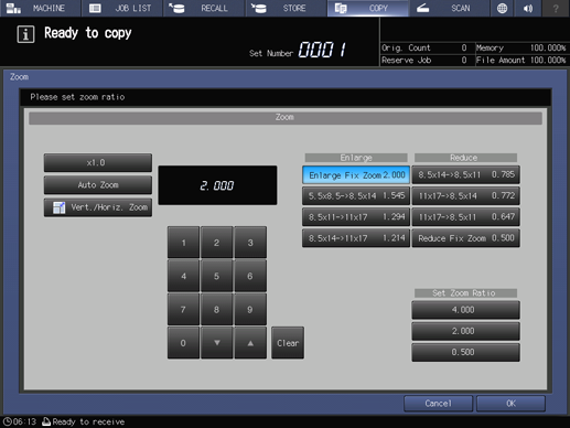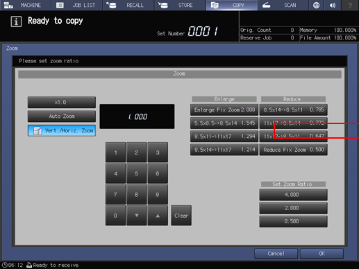 The settings of Enlarge/Reduce (fixed) and Set Zoom Ratio are provided on the UTILITY screen. For details, refer to Set Zoom Ratio Setting.