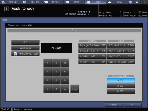 Press Vert./Horiz. Zoom to highlight it. Then, use the touch panel keypad or downup to enter the desired magnification ratio. The entered ratio is displayed on the screen.