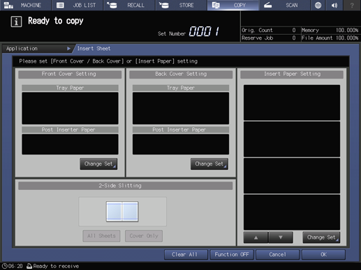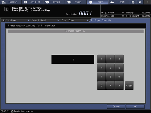Insertion setting | From the post inserter, covers can be attached up to 40 sheets. Press Quantity Set to specify the number on the keypad on the screen, then press OK. |