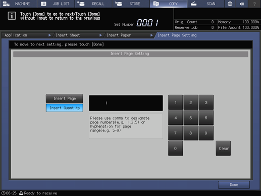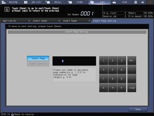 supplementary explanationEnter the insert page number using the keypad on the screen. When specifying multiple pages, delimit them with a comma (,). When specifying the range, insert a hyphen (-) between page numbers. Up to 20 characters can be specified, including a command hyphen.