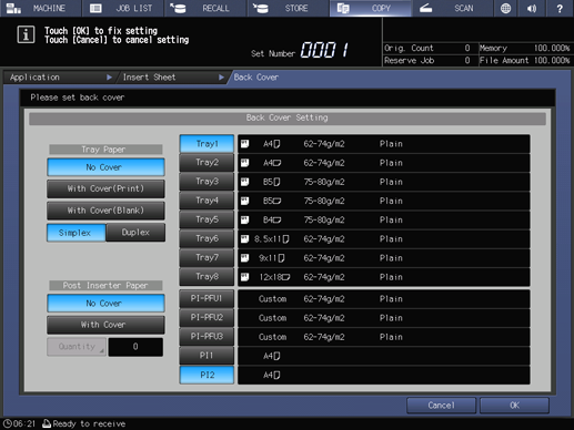 supplementary explanationPaper for cover can be simultaneously fed from a paper tray and post inserter tray. In that case, the post inserter feeds the first (front) cover and the last (back) cover.