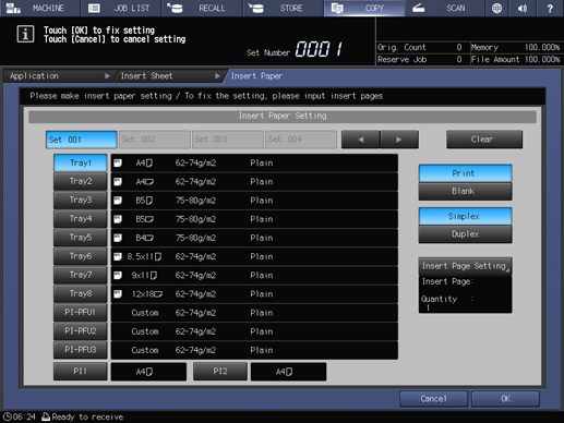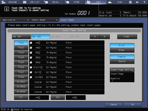 supplementary explanationIf a post inserter tray is selected as a paper tray, specify the insert quantity. Press Insert Quantity to enter the desired number of sheets using the keypad on the screen. You can specify up to 40 sheets.