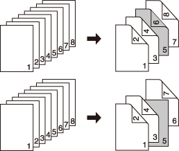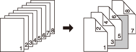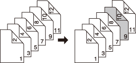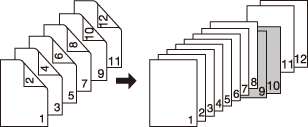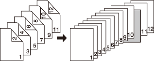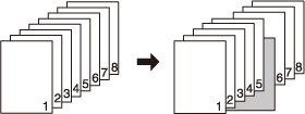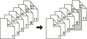 2->1 | A blank sheet will be inserted after the 5th sheet (the 9th and 10th pages) of double-sided original are simplex-copied. A sheet cannot be inserted after an odd-numbered page of copied set. ![]() |