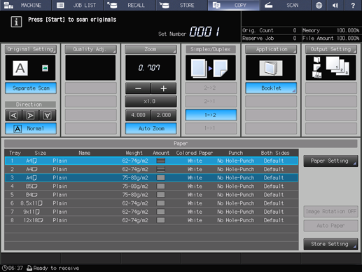 preconditionSelect a body set from the Paper list on the COPY screen. The longer side of the selected paper is divided into two parts to be printed. The Automatic Image Rotation functions as needed. Also, Auto Zoom is automatically selected.