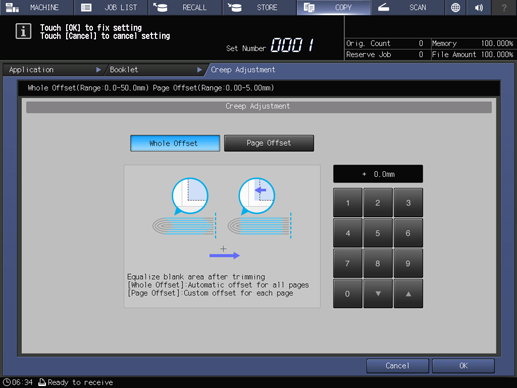supplementary explanationDisplay the Creep Adjustment screen, and then select Whole Offset or Page Offset. Then, use the touch panel keypad or downup to enter the offset amount. Press OK.