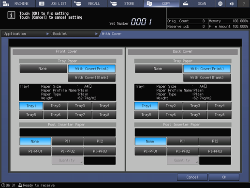 supplementary explanationThe paper tray for the body sets is automatically selected as default. If you also select With Cover in step 6, the two tray keys are selected. To change the tray for cover, refer to step 7.