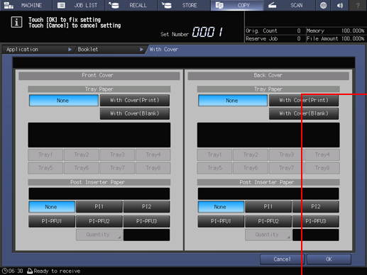 supplementary explanationWhen there is an original to be copied on the back cover, select With Cover(Print) under Back Cover. When there is a blank original on the back cover, select With Cover (Blank) under Back Cover, then select the paper tray in which a cover sheet has been loaded in step 2. If there is no original page for the back cover, select None.