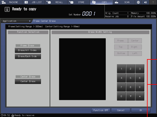 supplementary explanationCheck that the center erase width under Erase Width Setting is highlighted. Use the touch panel keypad or downup to enter the desired erasure width.
