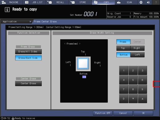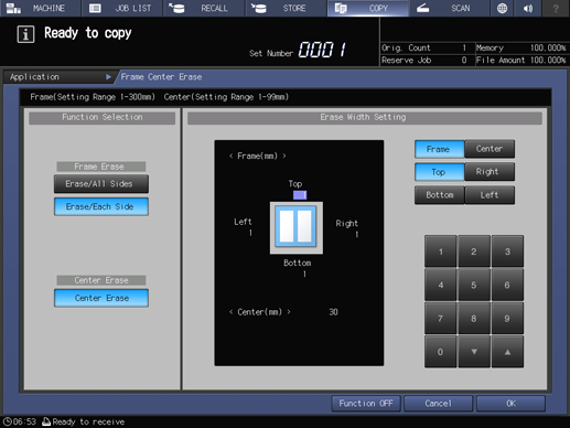 preconditionYou can set from 1 mm to 300 mm for Frame Erase width and from 1 mm to 99 mm for Center Erase width in 1 mm increments.