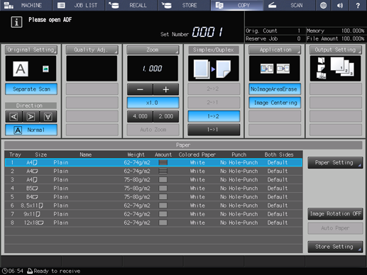 No Image Area Erase is set automatically, but it is released when the ADF is used. No Image Area Erase can be released manually. The incompatible function keys are dimmed to show inactivity.