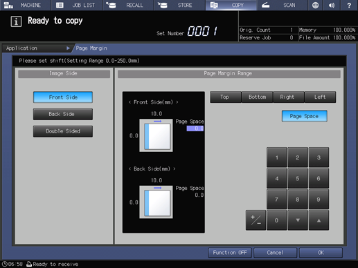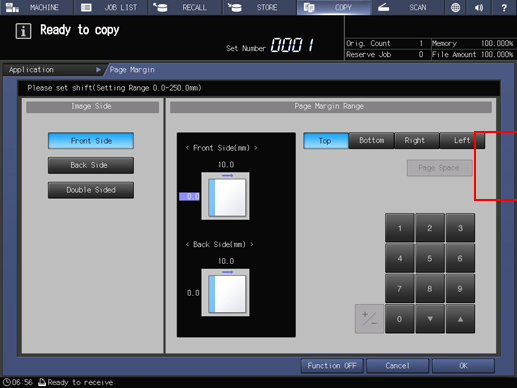 Use this function to create a binding margin on copies in order to make it easier for filing purposes, and also to adjust the position of copy image on both front and back sides when making 2-sided copies, in order to correct the image dislocation.