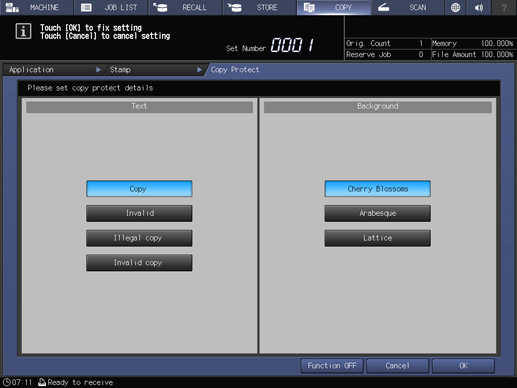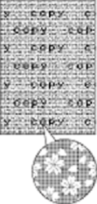 Copy Protect | When you use a sheet printed with the Copy Protect function as original, light gray-colored text and background as well as the copy image will be printed on the output result. There are 4 types of text and 3 types of background; select one from each category and use them in combination. | ||