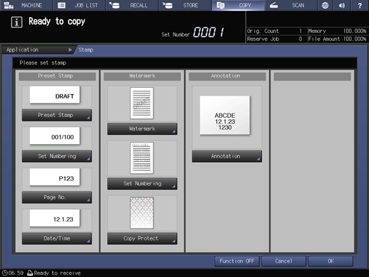 supplementary explanationTo cancel the Stamp function with the configuration information saved, press Function OFF.