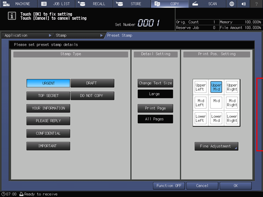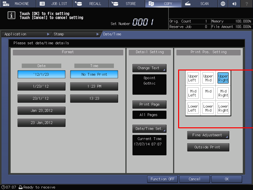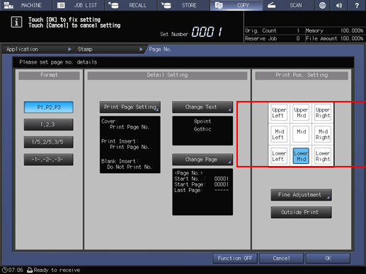 Print Pos. Setting | Select one of the 9 printing positions provided under Print Pos. Setting. If fine adjustment is desired, press Fine Adjustment. Press Outside Print to print numbering on the outside edges of facing pages. |