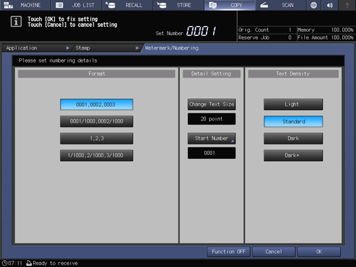 supplementary explanationUse the touch panel keypad or downup to enter the start number in the range from 1 to 99999. Entering 0 automatically sets the start number to 1.