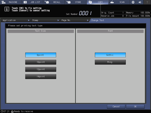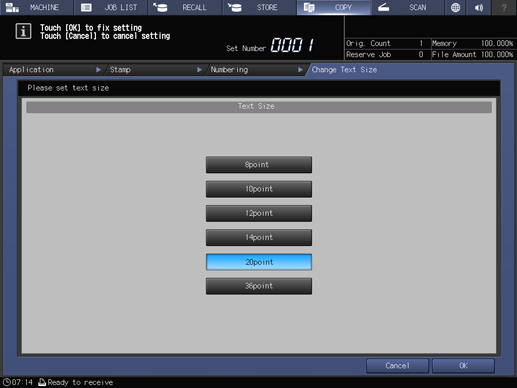 Press Change Text Size on the Numbering screen to display the Text Size screen. This example describes Numbering of Preset Stamp.