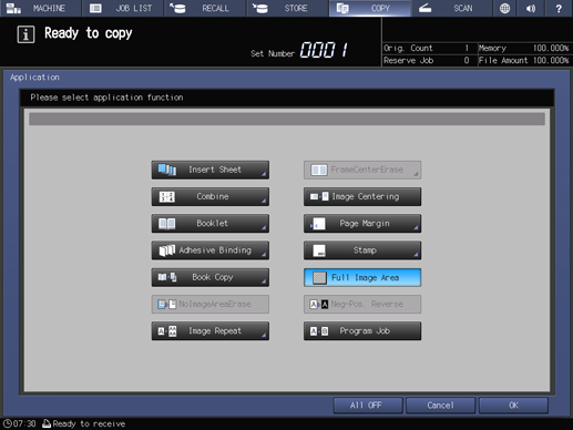 The Full Image Area icon and shortcut key are displayed under Application on the COPY screen.