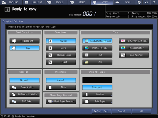 To display the Original Setting screen, press Original Setting on the COPY screen.