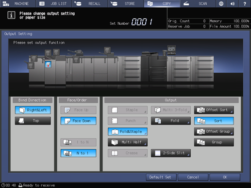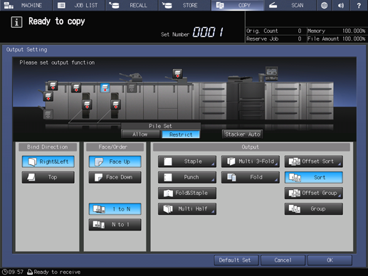 • supplementary explanationWhen Large Capacity Stacker LS-506 is mounted, Pile Set is displayed. If two Large Capacity Stacker LS-506 units are mounted, Stacker Auto is displayed. For details, refer to Switching Stacker Automatically.