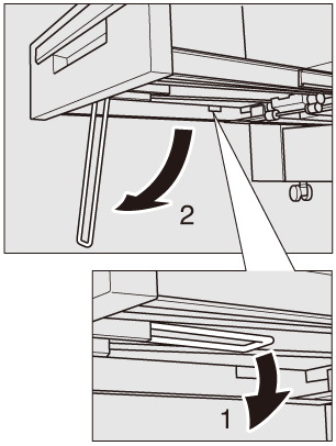 • When using the delivery tray of the saddle stitcher, be sure to fully withdraw it. Open the tray stand located under the delivery tray of the saddle stitcher when fully withdrawing it.