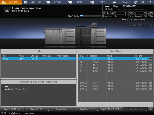 At this time, the message Please remove paper from main tray exit appears in the message area of the screen, and the Start LED turns orange. The machine cannot resume printing even if you press Start on the control panel.